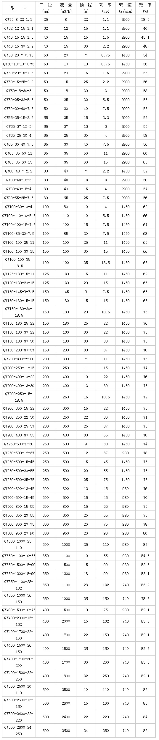 WQP型不(bu)鏽鋼(gang)無堵(du)塞潛(qian)水泵(beng)性能(neng)參數(shu):
