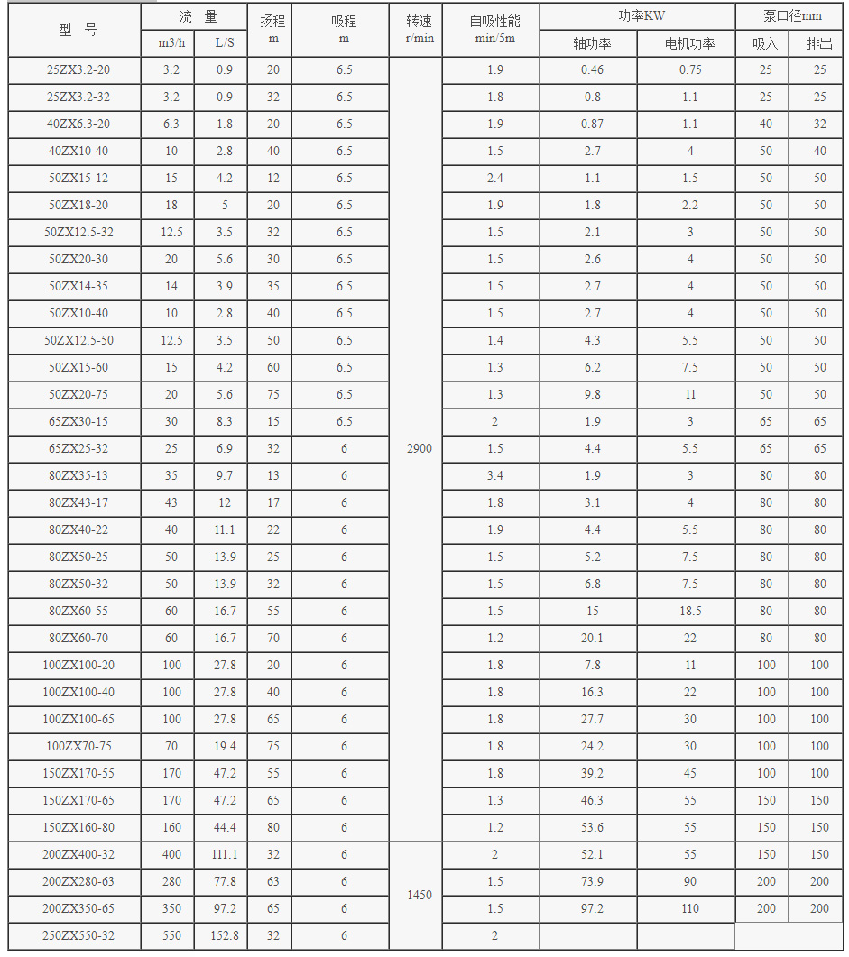 ZX系(xi)列自吸泵(beng)性能參數(shu):