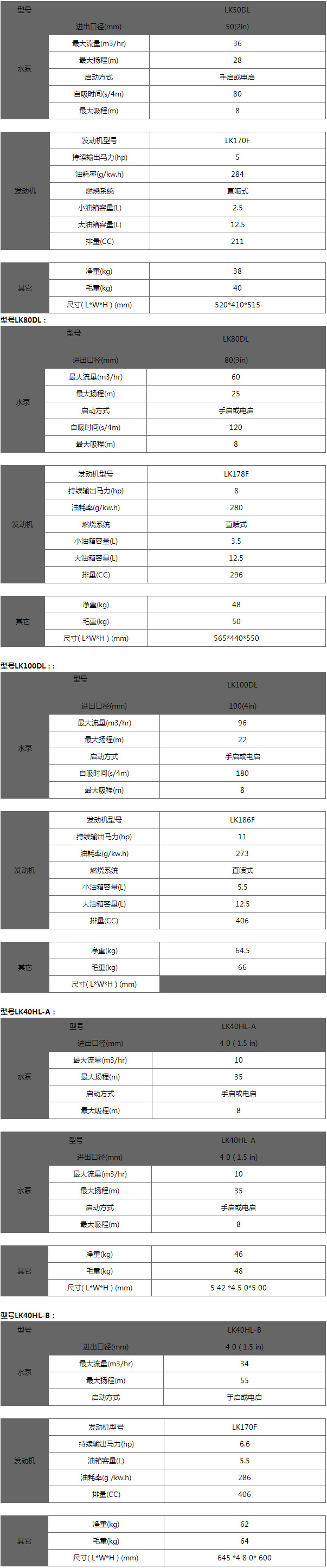 單缸(gang)風冷(leng)柴油(you)自吸(xi)水泵(beng)技術(shu)參數(shu): 型号(hao)LK50DL: